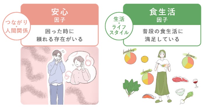 単身世帯にとって重要度が高い一方、非単身世帯と比較して満足度が低い因子として「安心因子」「食生活因子」が挙げられます。「困った時に頼れる存在がいる(安心因子)」は男性のスコアが特に低くなっています。また「食生活に満足しているか(食生活因子)」は、単身世帯にとって非常に重要なテーマです。“どうにもならない問題”ではなく、単身世帯自身の変化や周囲のサポート、企業が提供するサービス等によって、幸福度向上に寄与できる要素と言えるでしょう。
