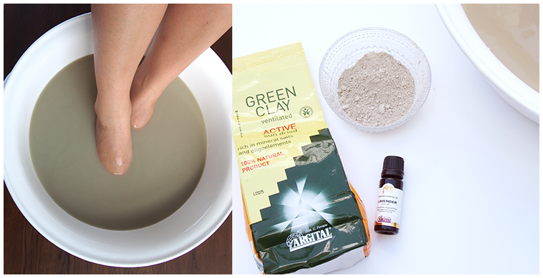 大きめのウォッシュボウルなどにお湯を入れ、グリーンクレイパウダーを適量(25~30gほど)溶かします。お湯で足を温めることで冷え対策しながら、グリーンクレイの吸着作用で、足にたまりやすい古い角質を取り除きすべすべに。