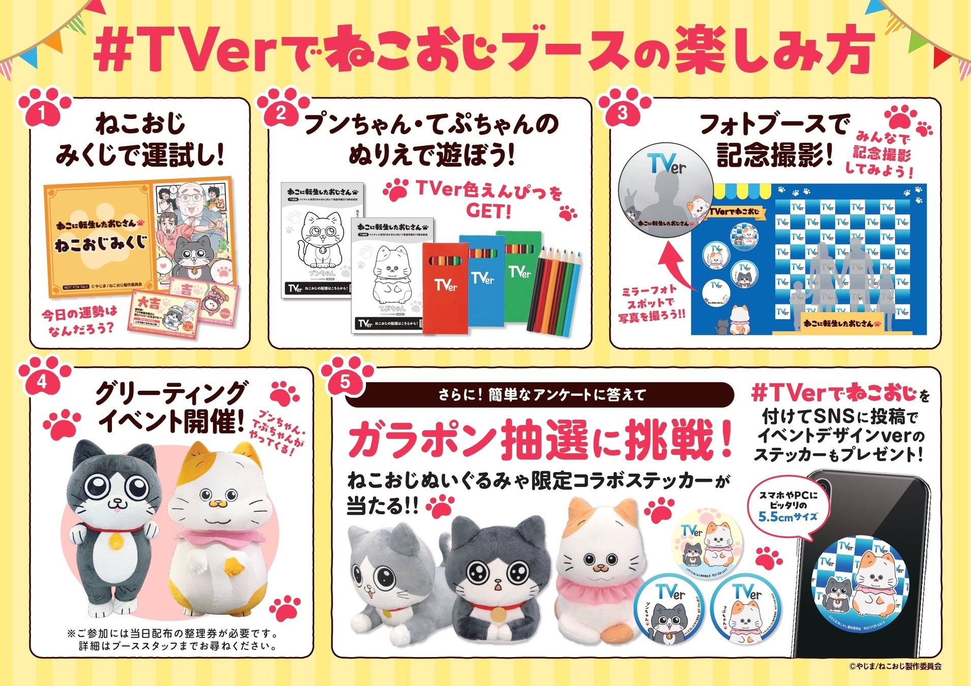 コラボブースでは、ファミリーで楽しめるTVerの活用方法を体感いただけるほか、参加無料の『ねこおじ』ぬりえにご参加いただくと、先着でTVerオリジナル色鉛筆セットをプレゼントします。ガラポン抽選会では、ぬいぐるみや会場限定のコラボステッカーなどのノベルティが当たるチャンスも!また、アニメに登場するねこの「プンちゃん」、「てぷちゃん」のグリーティングも予定しております。