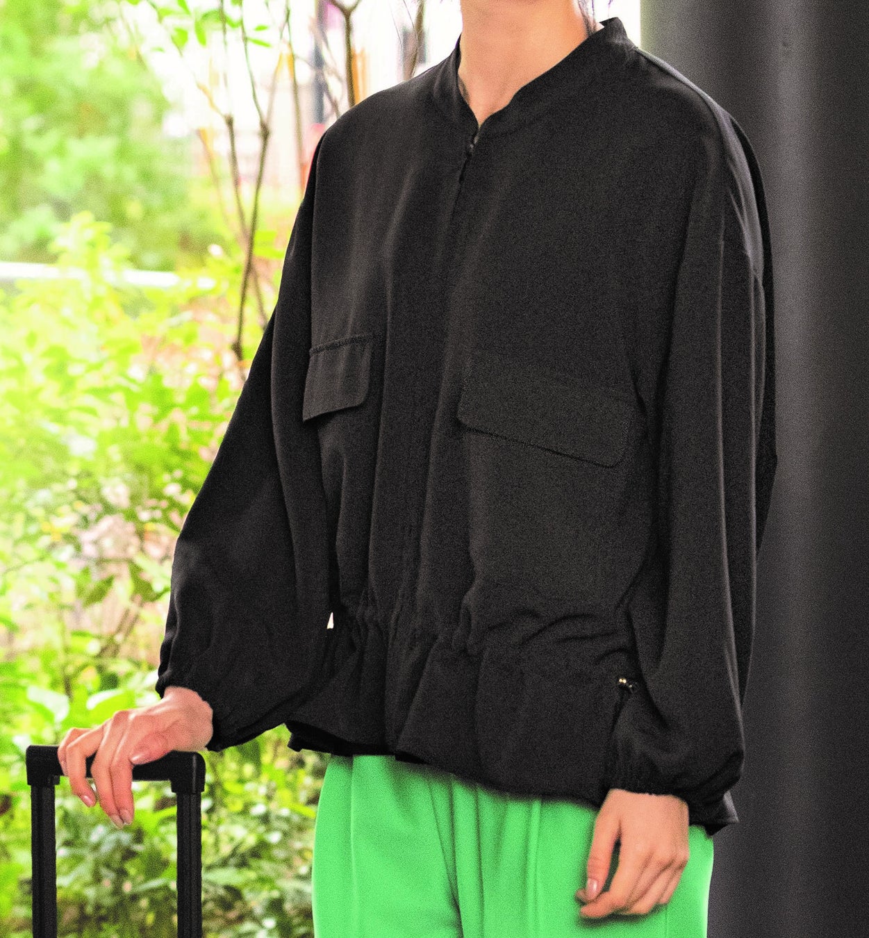 エーエフコンフィは、デザイナーの恭子エドワーズ氏による大人カジュアルなアイテムを発信しているブランドで、 “コンフィ”は、“快適”を意味します。今回は爽やかな季節に相応しい、とろみ感のある素材で仕立てた薄手のライトブルゾンを紹介します。ゆったりとしたフレアーシルエットで、裾に付いたスピンドルを絞ることで、シルエットの変化を楽しむことができます。