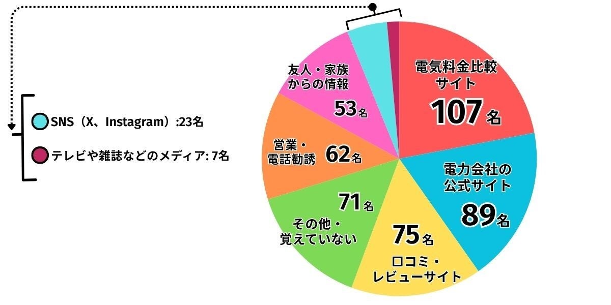 情報収集方法については、「電気料金比較サイト」が107名(21.97%)で最多、「電力会社の公式サイト」の89名(18.28%)が続く。