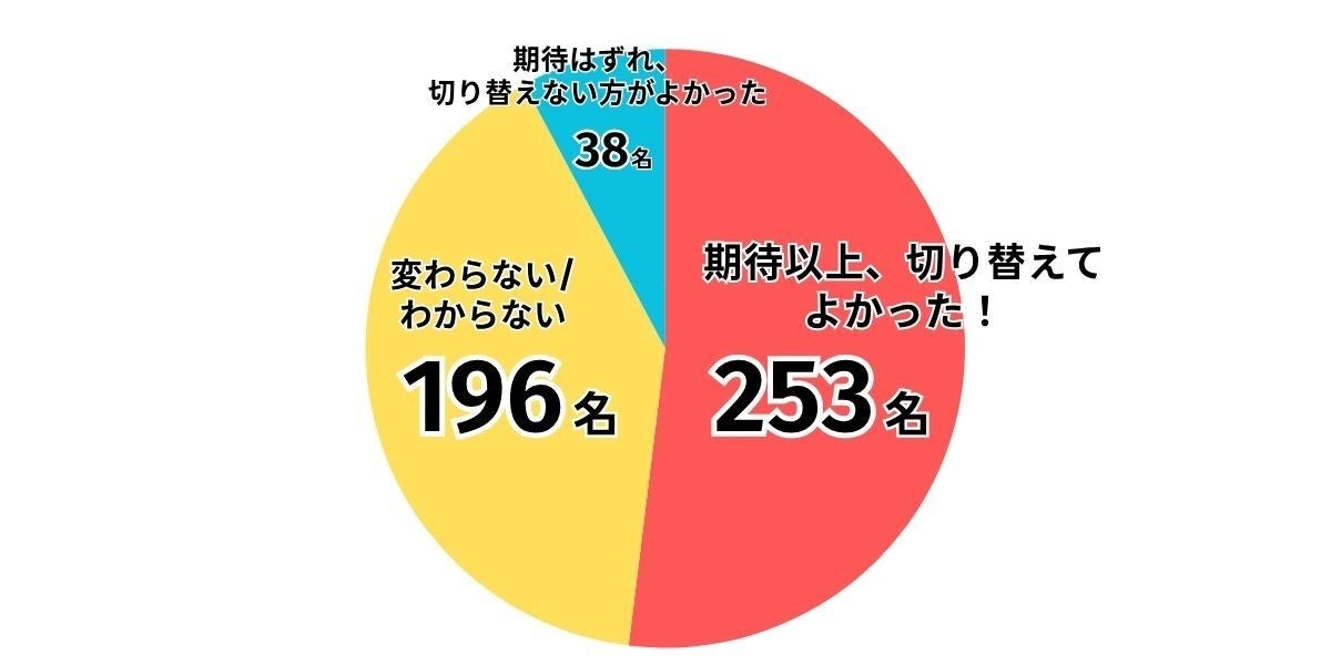 一方で「変わらない/わからない」が196名(40.25%)と4割を占めており、切り替え効果を実感できていない層も相当数存在することがわかります。