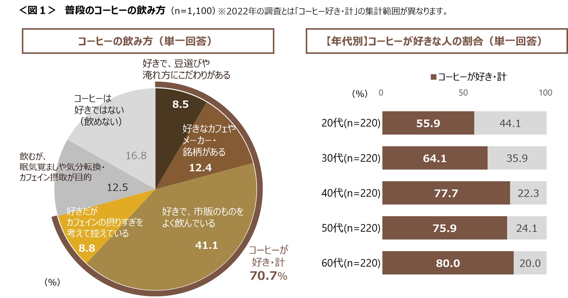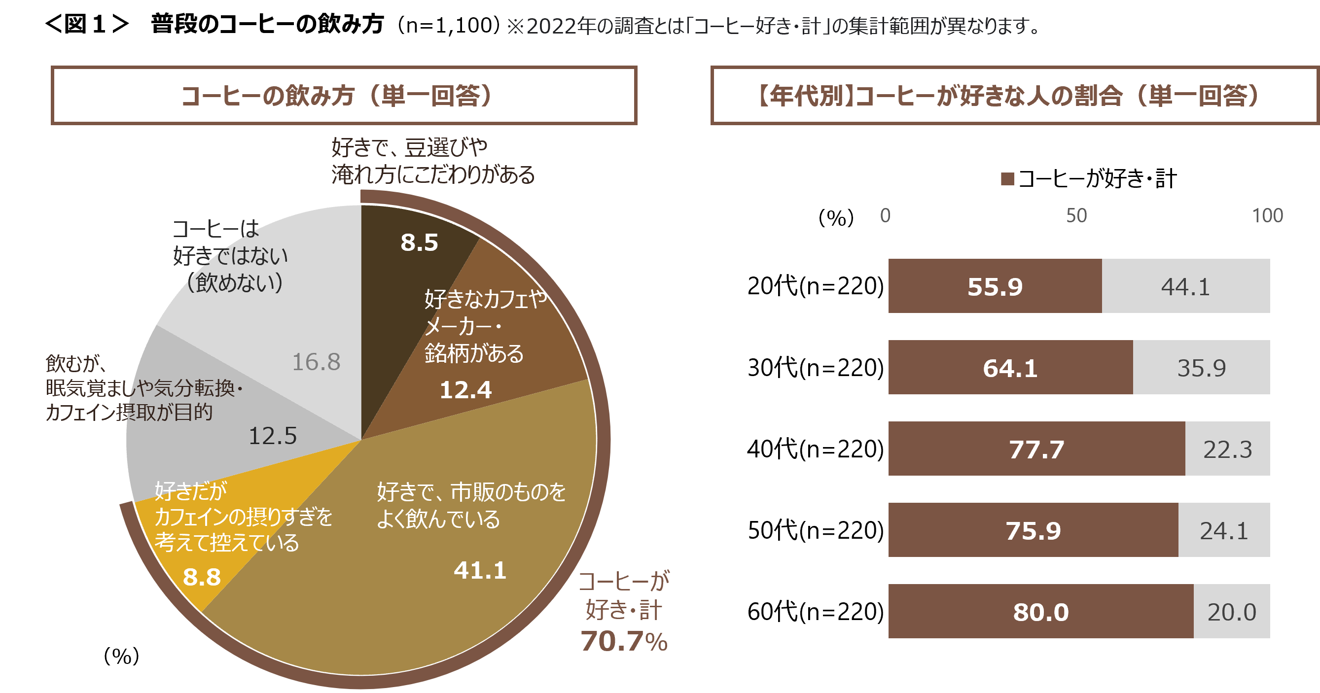 コーヒーの飲み方では、「市販のものをよく飲んでいる」の割合が4割と最も高い。年代別でみると若年層ほどコーヒー好きの割合は低く、60代が8割なのに対し20代では5割台半ばにとどまる。<図1>