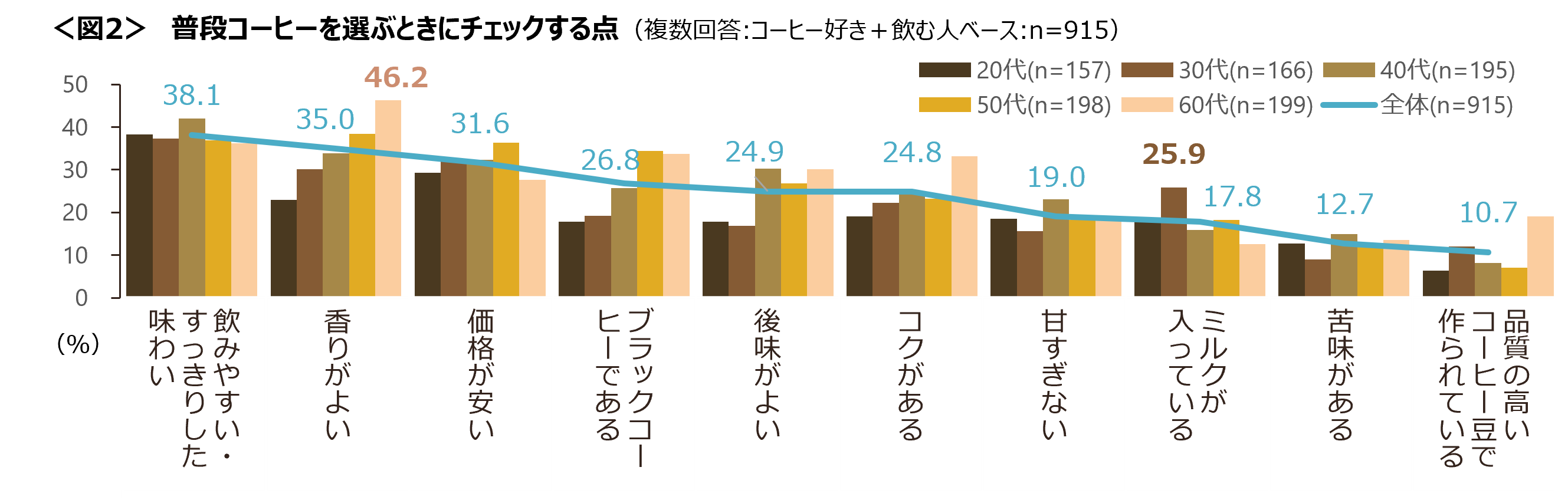 普段コーヒーを飲むとき、30代では、約4人に1人が「ミルクが入っている」ことを重視している。60代では、半数弱が「香りがよい」ことをチェックしている。