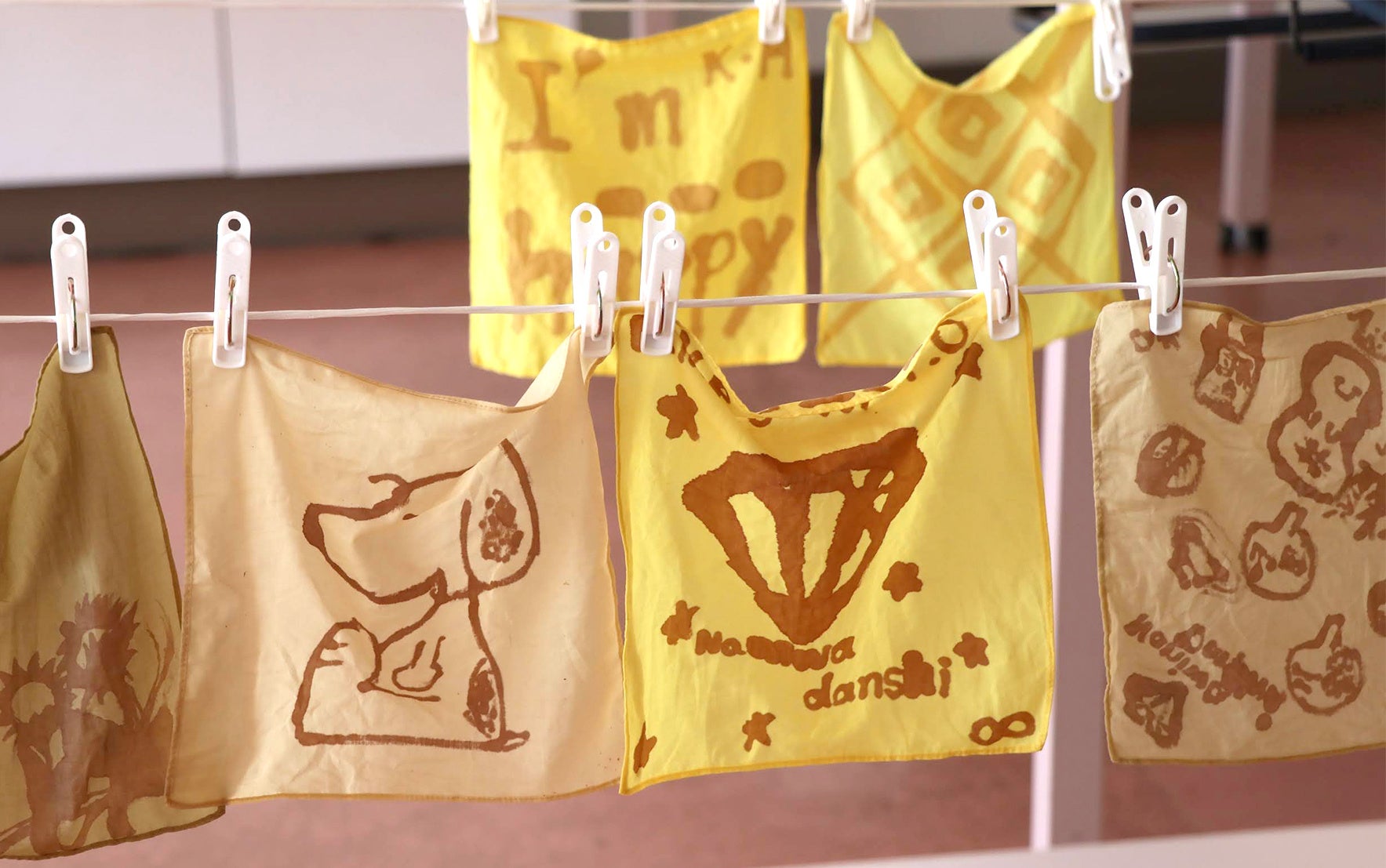 捨ててしまうものにもう一度価値を見出し、ハンカチを生徒自らがやさしい色合いに染めあげます。実習の合間にはSDGsの基礎をおさらいし、理解を深めます。