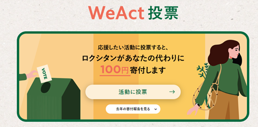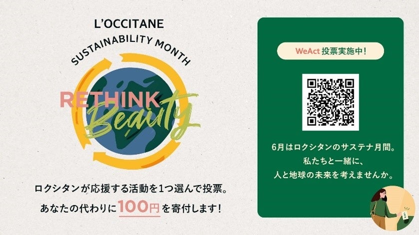 ロクシタンでは、一人ひとりが小さくてもアクションを起こすことが変化を生み出すと考え、昨年からサステナ月間に「We Act投票」を実施。誰でも気軽に参画していただける機会として、6つのCSR活動の中から応援したい活動に投票すると1投票につき100円を投票者に代わってロクシタンが寄付する仕組みで、今年も6月1日にスタートいたしました。