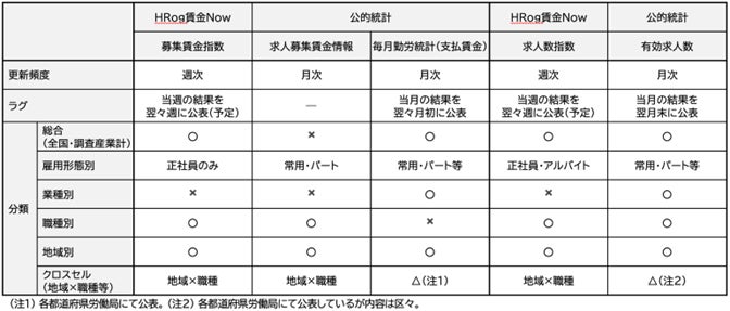 「HRog賃金Now」は、労働市場に関する各種公的統計と比較して高い頻度性と速報性を持ち、「地域×職種」のクロスセル分析が容易な賃金動向指数サービスです。公的統計と「HRog 賃金Now」 とを合わせて見ることで公的統計の数値を相対化し、解釈にさらなる深みをもたらすことができます。求人広告データの取得日から2週間後という高い速報性で指数を提供しており、指数は週次で更新され、水準値や前年同期比でもご覧いただけます。