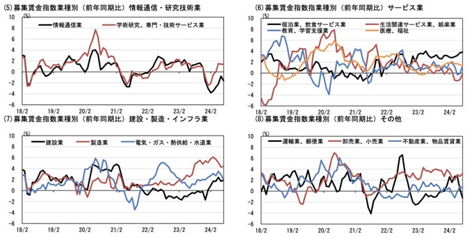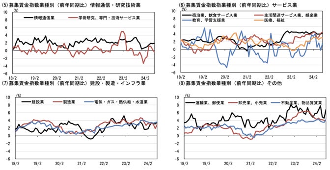正社員の業種別募集賃金前年比は6月と比べて上昇、横ばい、減少と多様な傾向が見られる。
