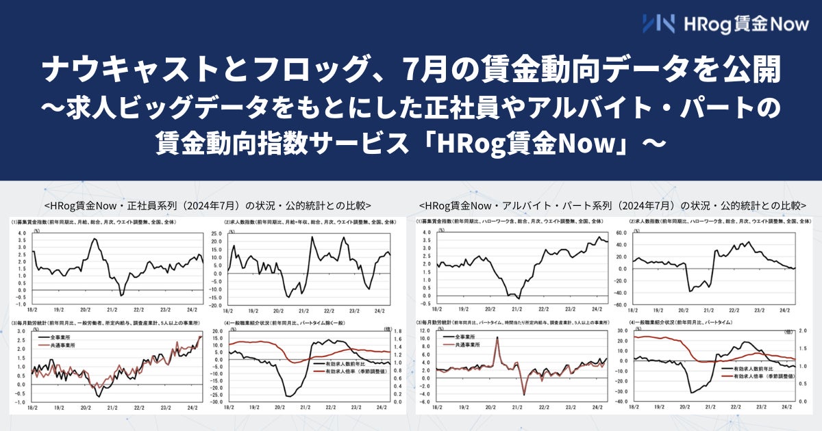 次世代金融インフラの提供を通して組込型金融を実現するFinatextグループの株式会社ナウキャスト(本社:東京都千代田区、代表取締役CEO:辻中 仁士、以下「ナウキャスト」)と、分析用求人ビッグデータを提供する株式会社フロッグ(本社:東京都千代田区、代表取締役・メディア統括:菊池 健生、以下「フロッグ」)は、本日、「HRog賃金Now(読み:フロッグ賃金ナウ)」の7月の賃金動向データ(2024年8月12日更新)の一部を公開しました。
