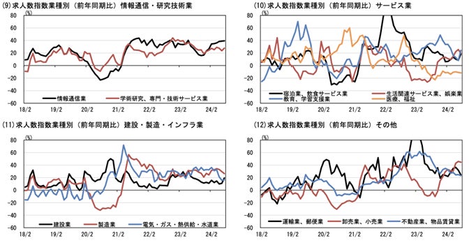 正社員では大きく減少していた「運輸業、郵便業」は、アルバイト・パートでは前年比+6.8%と高い水準に戻っている。