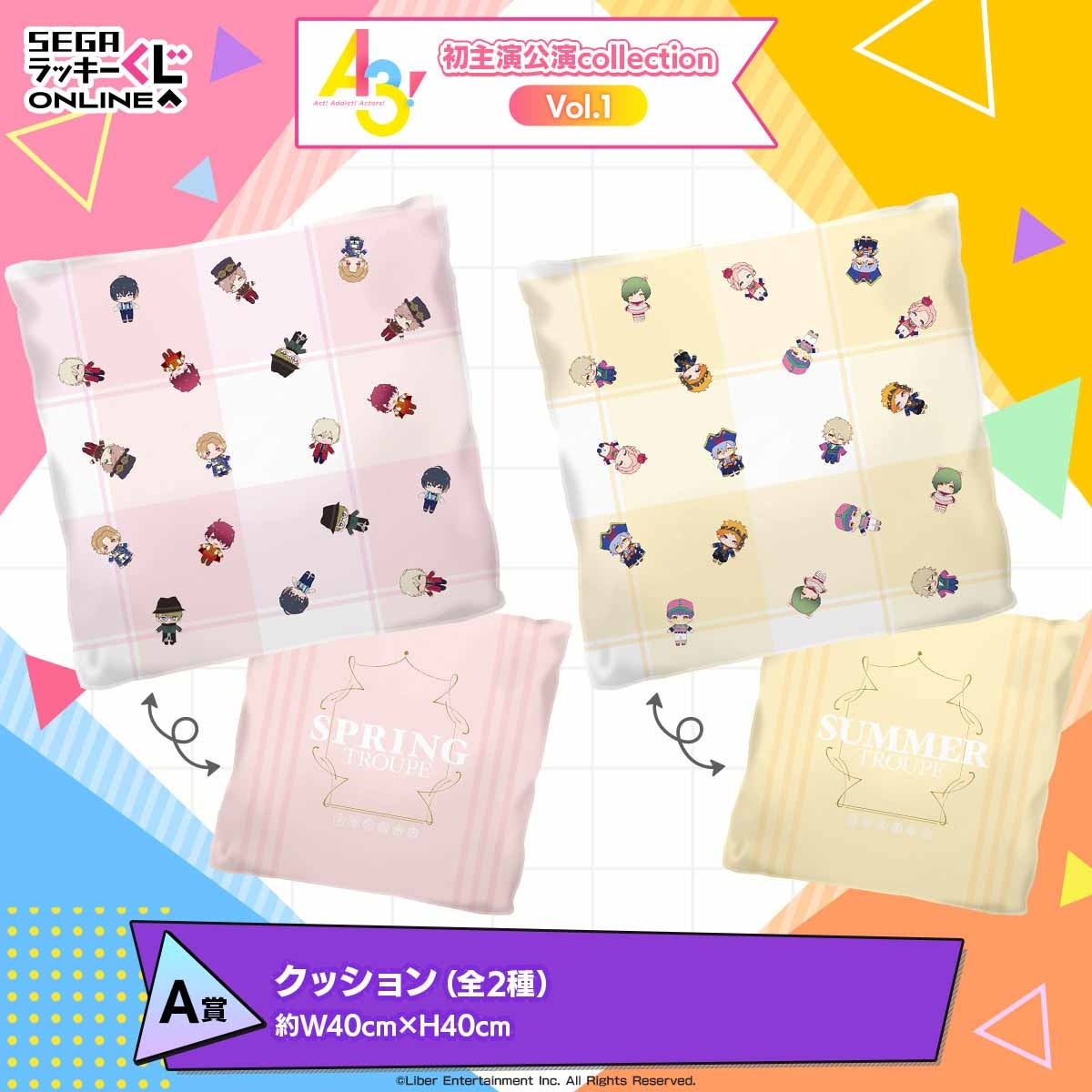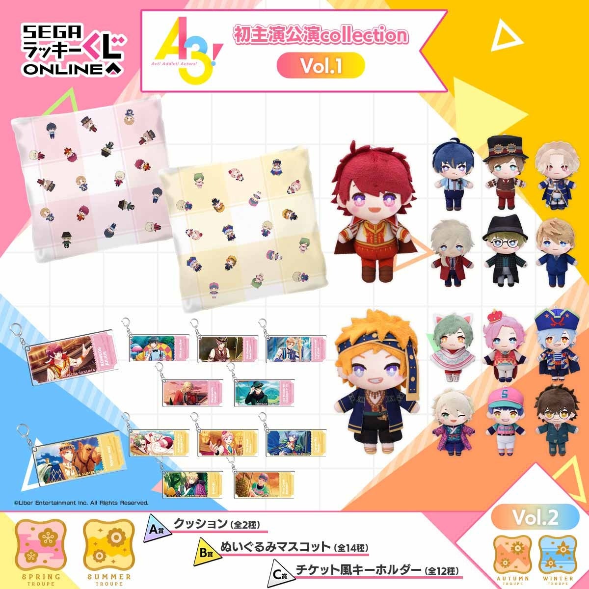 本日発売のvol.1では、A~C賞にて春組・夏組の「クッション」、「ぬいぐるみマスコット」、「チケット風キーホルダー」、D~F賞にて、秋組・冬組の「キラキラ缶バッジ」、「ミニアクリルスタンド」、「ステッカーセット」がラインナップされています。