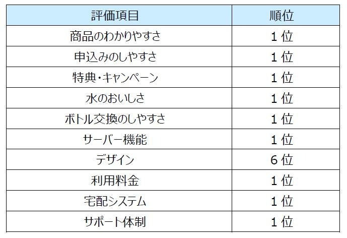 本年は評価項目の水のおいしさや、申込みのしやすさ、宅配システムなどを評価いただき、4年連続で総合ランキング第1位を獲得いたしました。