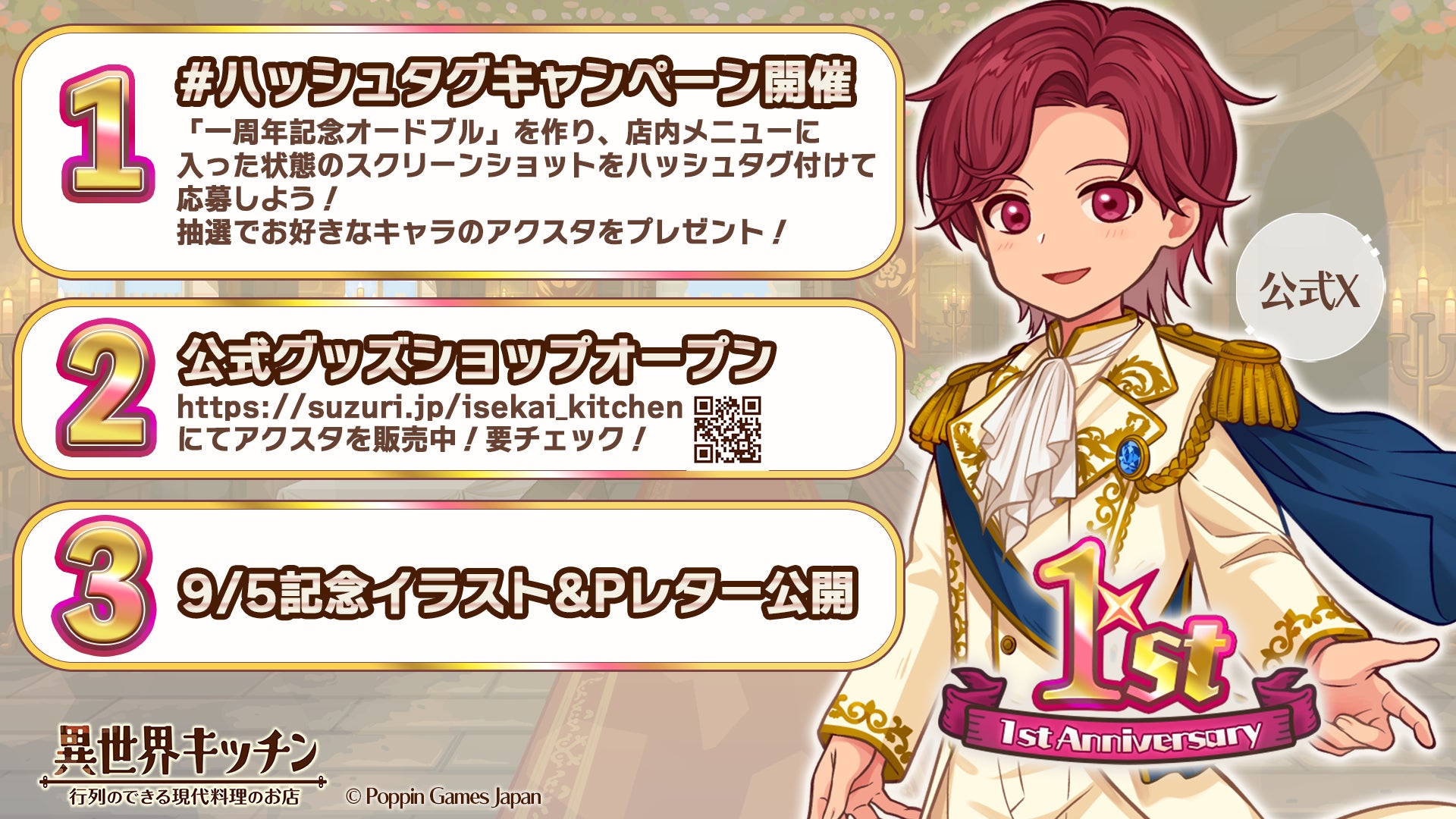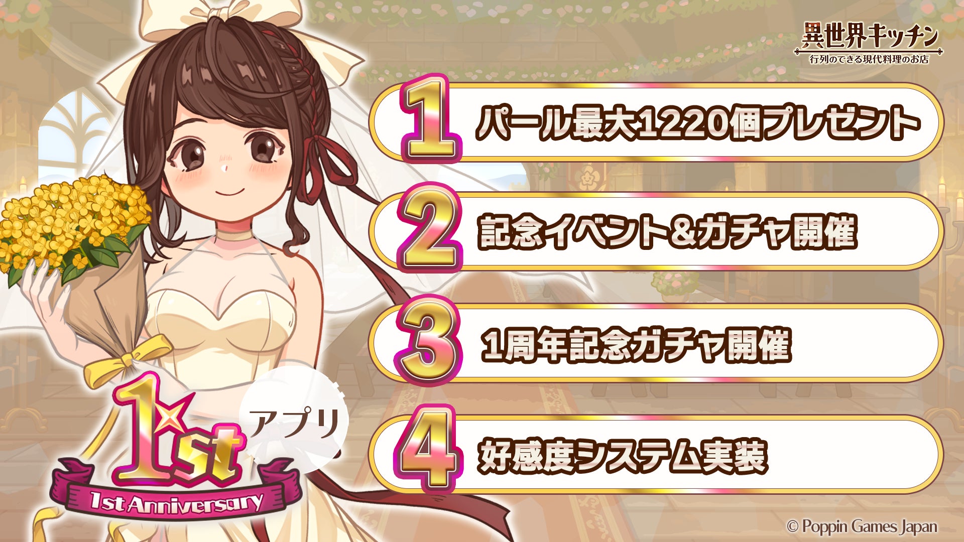 ポッピンゲームズジャパン株式会社がAppStore/GooglePlayで配信中の『異世界キッチン 行列のできる現代料理のお店』は、おかげさまで2025年9月5日(金)をもちましてアプリリリース1周年を迎えます!