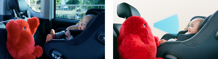 ②イルヨがチャイルドシートに座る赤ちゃんの表情の変化をカメラで検知。赤ちゃんの目の開閉を感知することでベビー イルヨも目を開閉。運転席のドライバーに、赤ちゃんが寝ているか起きているかを知らせます。
