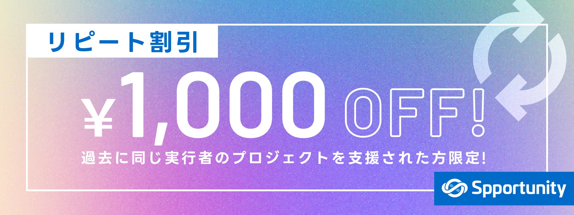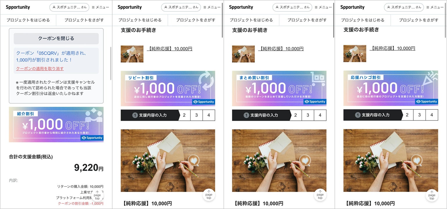 過去に同じ実行者のプロジェクトを支援したことがある場合に使える割引クーポン。過去にスポチュニティで同一実行者のクラファンプロジェクトへ支援したことのある支援者を割り引くことで、リピート支援を確実に獲得することができます。