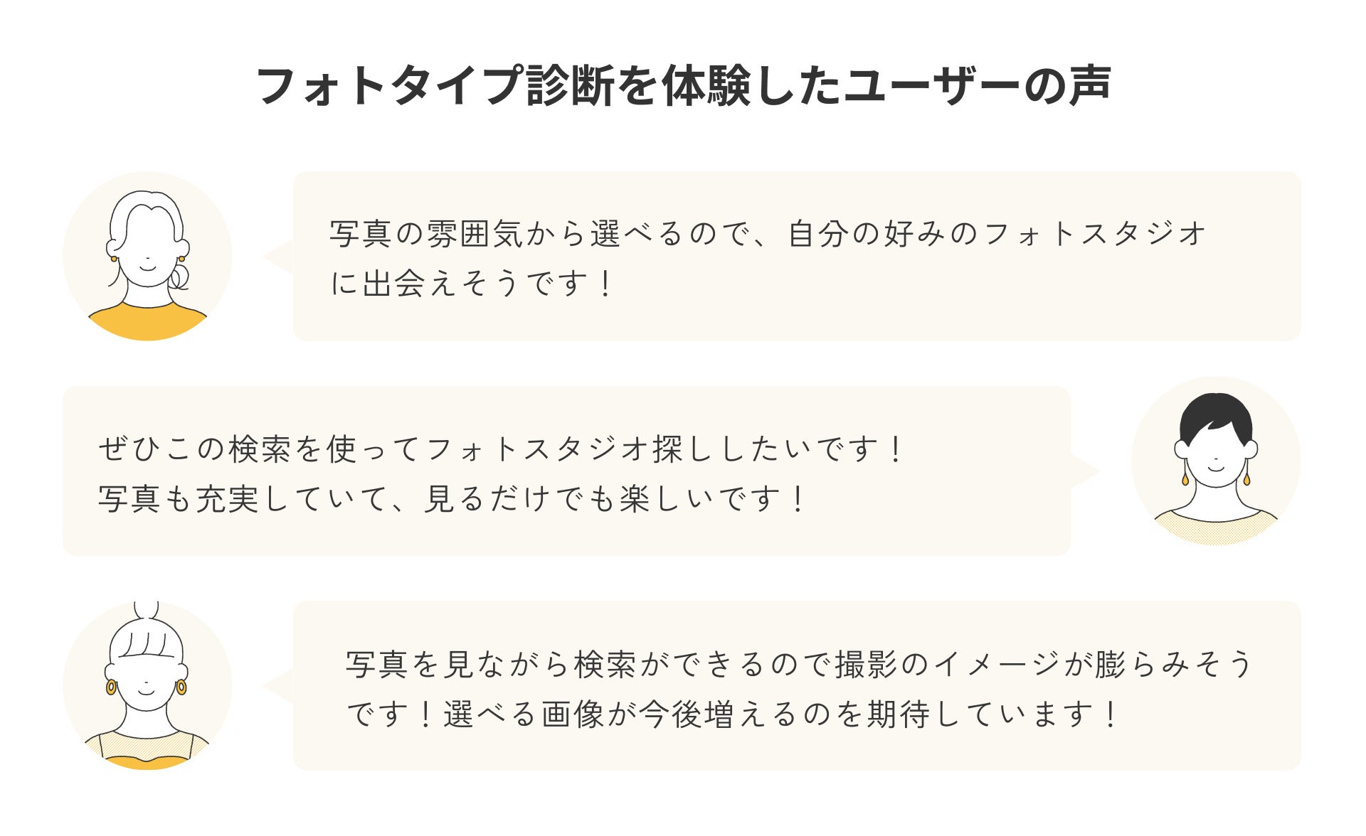 従来、フォトスタジオを探す際は、撮影エリアやこだわり条件(衣装や撮影場所など)からの検索が主流でした。しかし近年では、検討初期ユーザーほど「自分のこだわりがわからない」「何を基準にすれば良いのかがわからない」といった、条件を絞り込むことに対するハードルが一定あることが、Photorait内のユーザー動向から見えてきました。そのような「まだこだわりがないユーザーのフォトスタジオ探し」のハードルを下げることを目的に、この度「フォトタイプ診断」機能をリリースいたしました。
