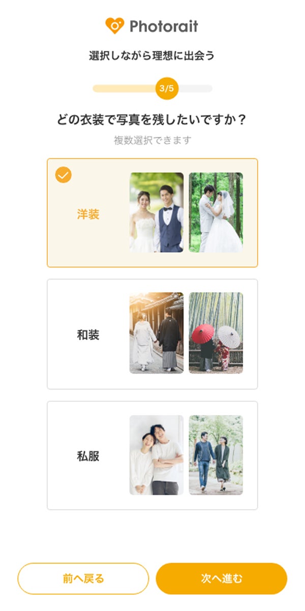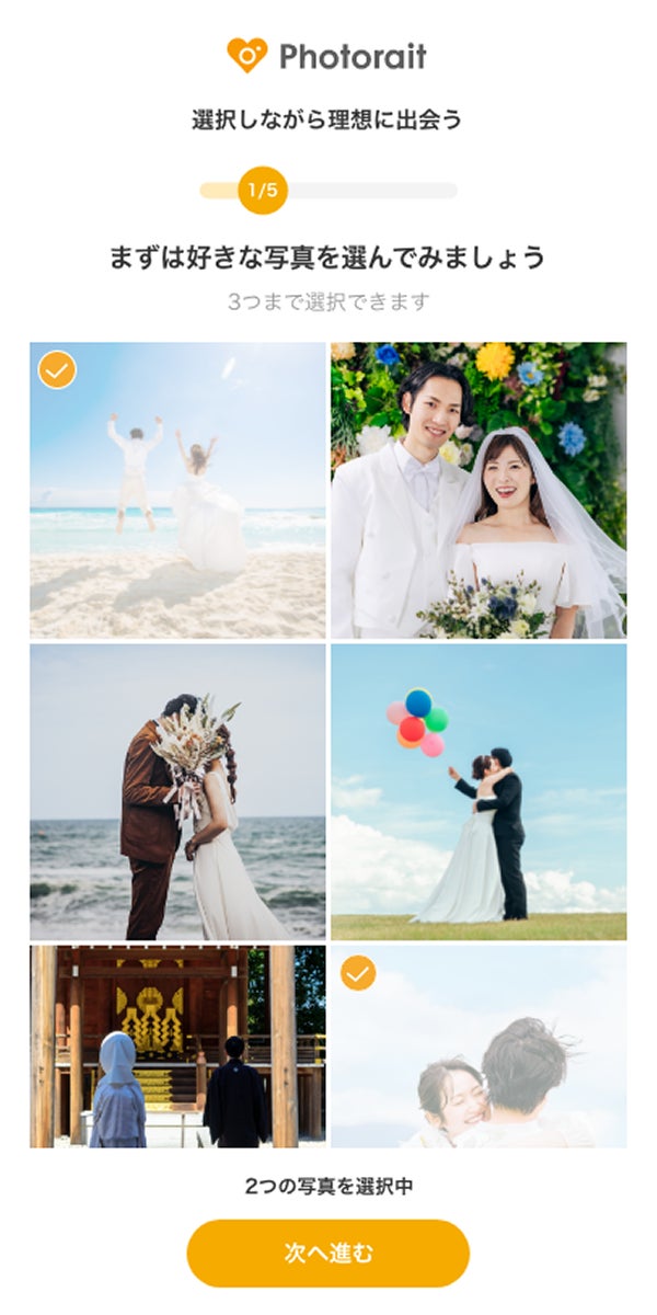 ユーザーは、60枚以上のウエディング写真から気になるものを選ぶだけ。具体的なイメージがない状態でも好みに近いフォトスタジオを提案します。