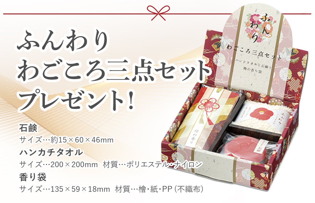 敬老の日キャンペーンでオーダーメイド枕ギフト券をご購入の方に、石鹸・ハンカチタオル・香り袋の『ふんわりわごころ三点セット』をプレゼントしています。