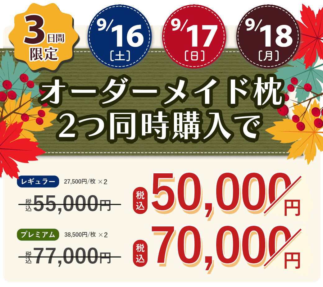 ●オーダーメイド枕「プレミアム」(38,500円)を2点ご購入で77,000円が70,000円に