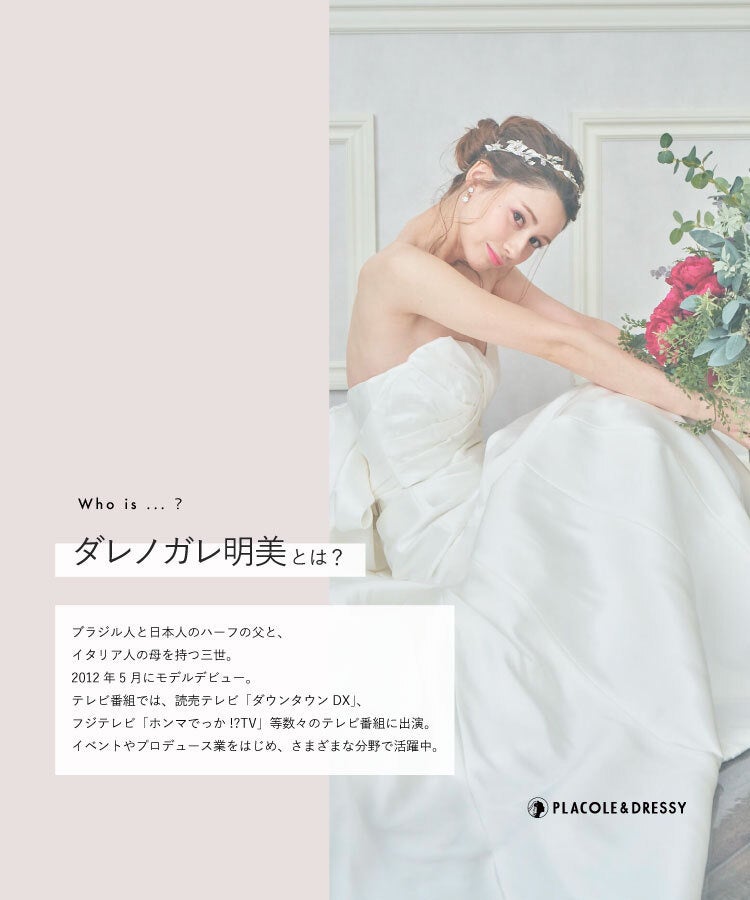 モデル ダレノガレ明美さんが花嫁アプリ『PLACOLE&DRESSY』にウェディングドレス姿で初登場!ウェディングドレスに憧れるすべての人へのメッセージとは?