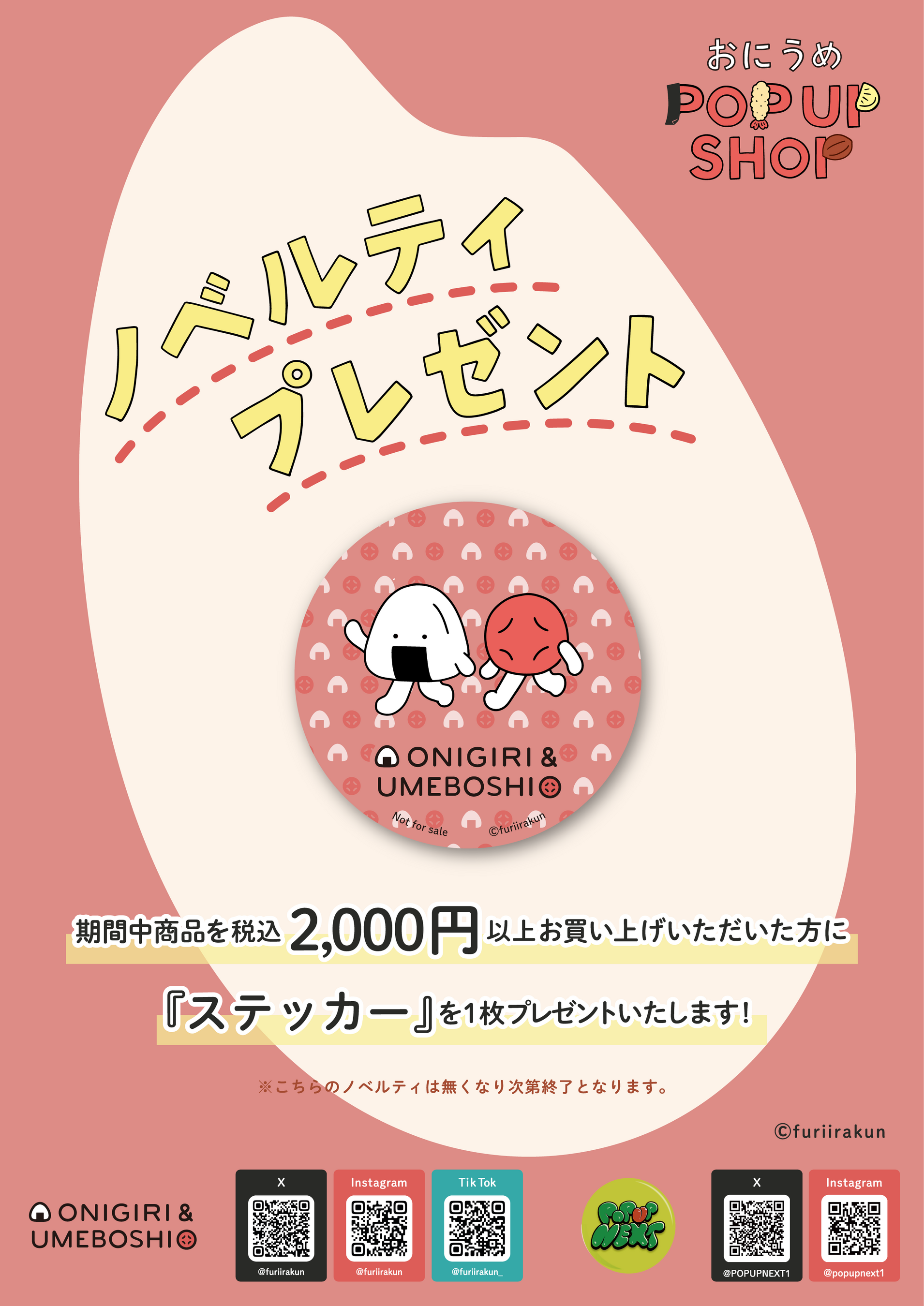 開催期間中、「おにうめ」関連商品を合計2,000円(税込)以上購入の方に、特典としてオリジナルステッカーを1枚プレゼントいたします。
