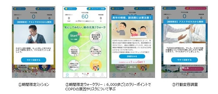 調査期間①で本人または家族に喫煙歴のあるユーザーを抽出するとともにCOPDに関する認知度調査(期間限定ミッション)を実施し、その後、調査期間②で①で抽出されたユーザーに対し疾患啓発につながる②ウォークラリーを実施しました。一定期間後に行動変容について調査を実施しました(調査期間③)。