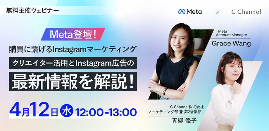 クリエイターを起点としたInstagramマーケティング支援実績が強みのC Channel株式会社(本社:東京都港区南青山7-1-5 コラム南青山7階 代表取締役社長:森川亮)と、SNS最大級プラットフォーマーであるMeta(日本法人 Facebook Japan株式会社 所在地:東京都港区虎ノ門1丁目17番1号虎ノ門ヒルズビジネスタワー)は、4月12日(水) 12時より無料オンラインセミナー【Meta登壇!購買に繋げるInstagramマーケティング 〜クリエイター活用とInstagram広告の最新情報を解説!〜 】を開催いたします。