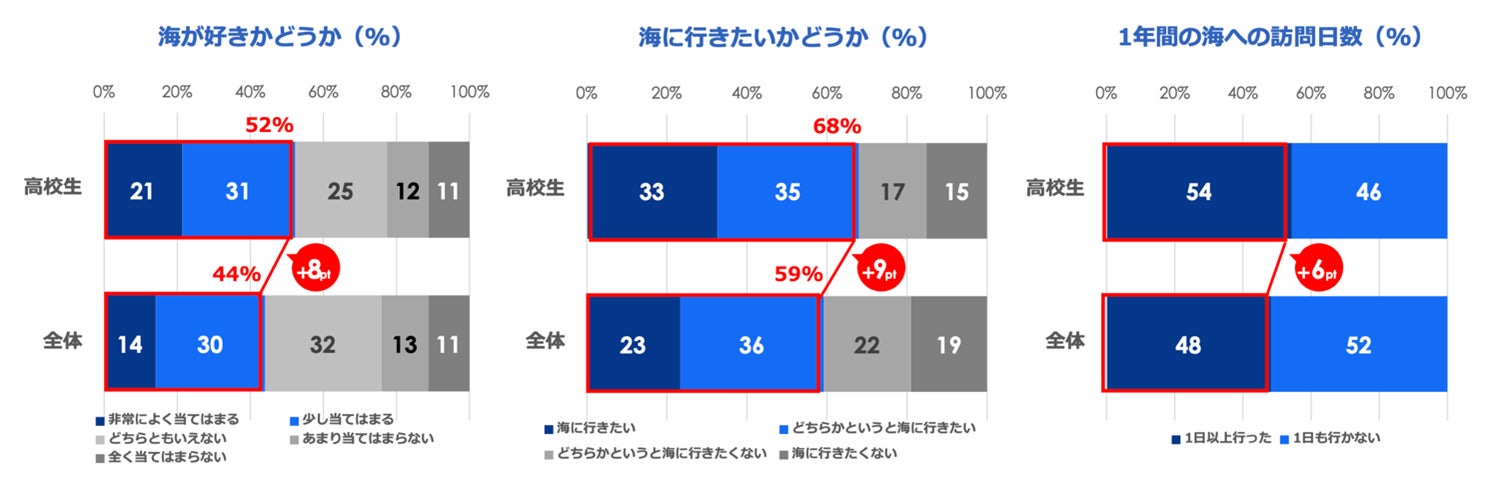 「海が好きだ」「海に行きたい」「1日以上海へ行った」の各項目は、全体より高くなっています。