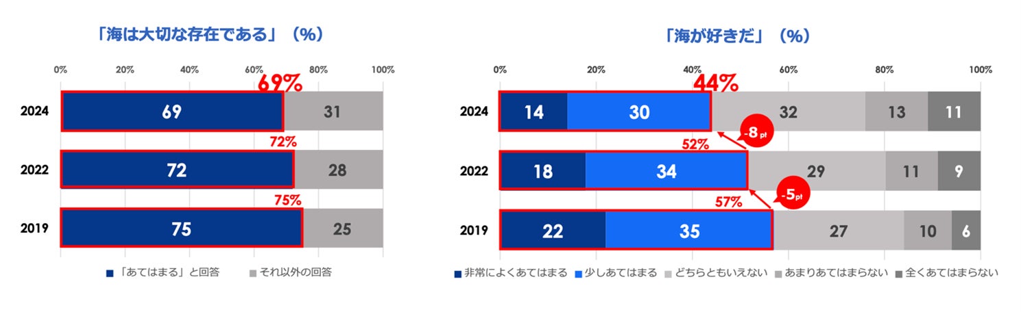 「海は大切な存在だ」の回答は約7割。一方で「海が好きだ」の回答は約4割。