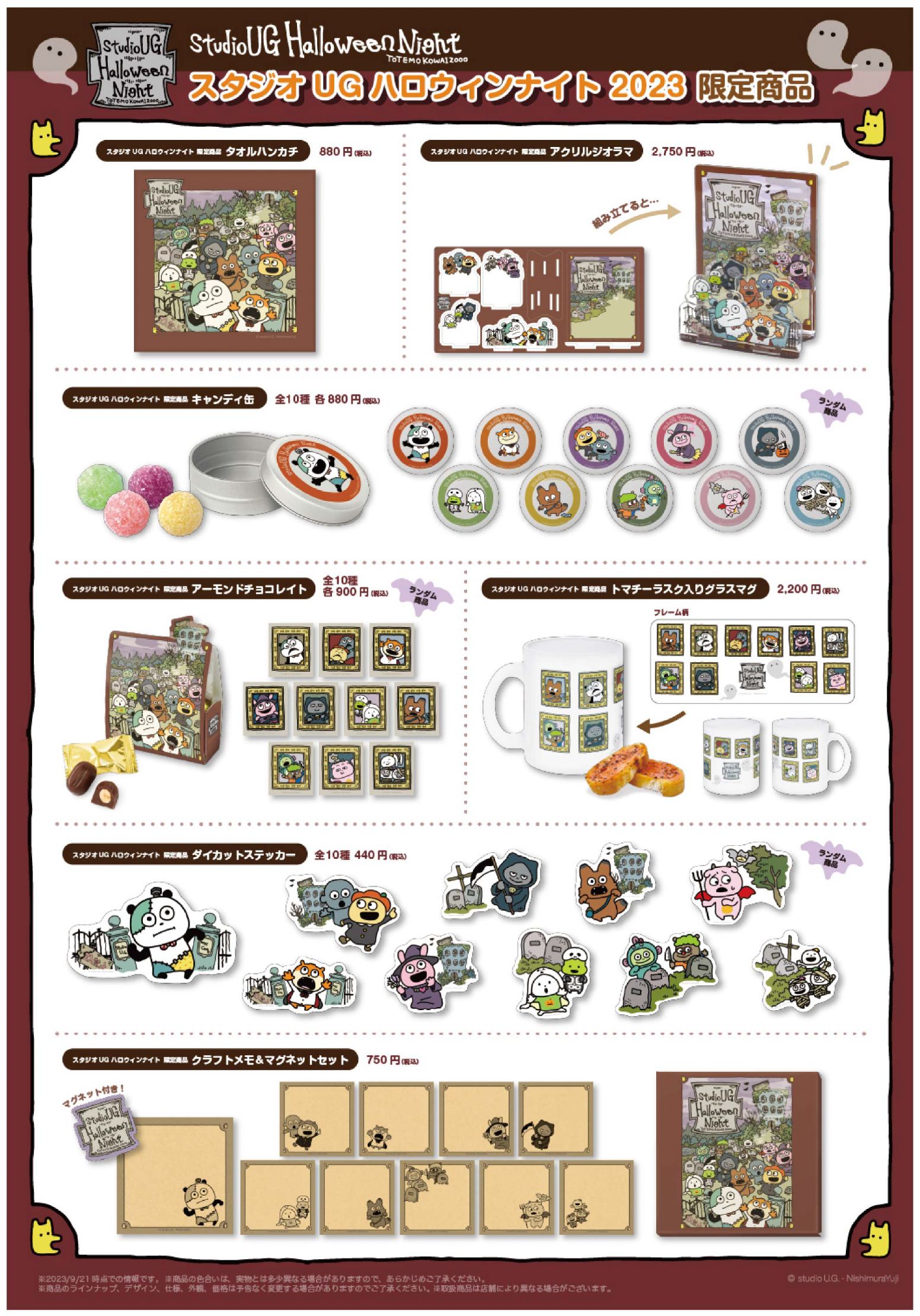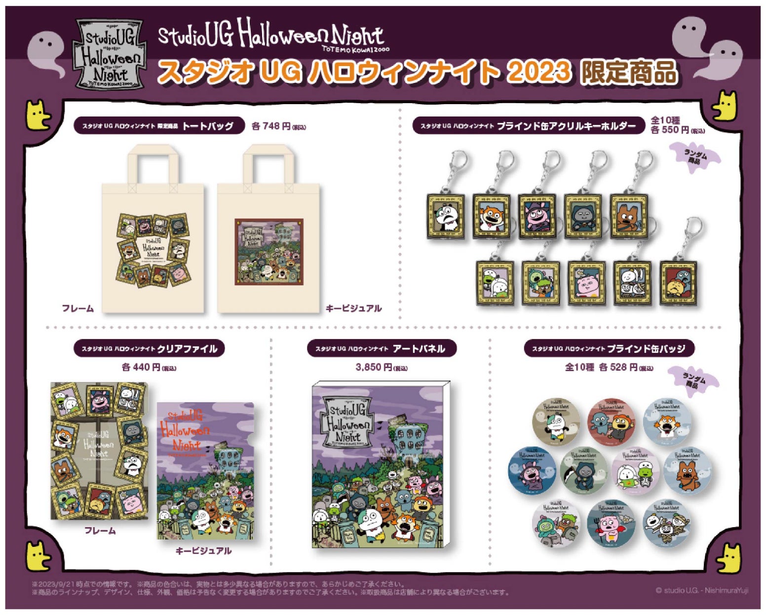 「スタジオ UG ハロウィンナイト 2023」では、スタッフの出勤時にマスク着用や手指消毒、お会計時にソーシャルディスタンスを保つためのお並び位置指定等を行い営業させていただきます。ご来店の際はマスク着用等のご協力をお願いいたします。また、混雑状況によっては密な状態を避けるために、入場整理券の配布や入店制限を行う場合がございます。