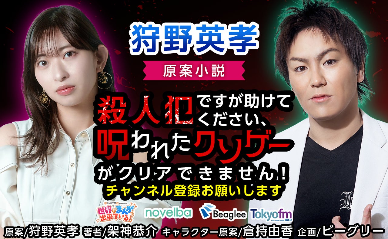 TOKYO FMにて毎週土曜日19:00-19:30に放送中の『まんが王国 presents 世界はまんがで出来ている!』でパーソナリティを務める狩野英孝さんが漫画原案に初挑戦。「完全教祖マニュアル」「仁義なきキリスト教史」等の作品で知られる作家兼ゲームデザイナーの架神恭介さんとタッグを組み、コミカライズに先駆けて「殺人犯ですが助けてください、呪われたクソゲーがクリアできません!チャンネル登録お願いします」の小説版を本日9月27日(金)より、当社が運営する小説投稿サービス『ノベルバ』で連載を開始いたします。『ノベルバ』では毎週金曜日に最新話を配信予定です。また、コミカライズに向けて、同じく番組パーソナリティの倉持由香さんがキャラクター原案を担当することが決定!乞うご期待ください!