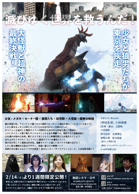 数々の商業映画を手掛けてきた公野教授の細緻なプロデュースのもと、本作は単なる趣味で終わらせず、アクション満載のエンターテイメントと、春休み公開に向けた「家族」という普遍的なテーマを追求。興行館を池袋シネマ・ロサと定め、保守本流の作品に挑戦する「映画の革命」として、特撮大作『ヴァリドマン』がここに誕生しました。