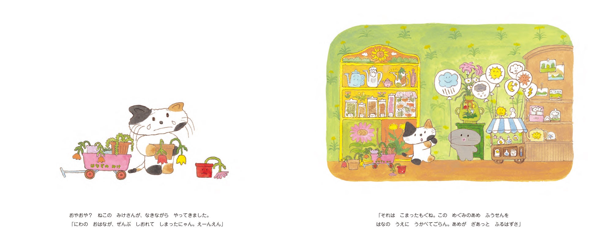 「にわの おはなが、ぜんぶ しおれて しまったにゃん。えーんえん」