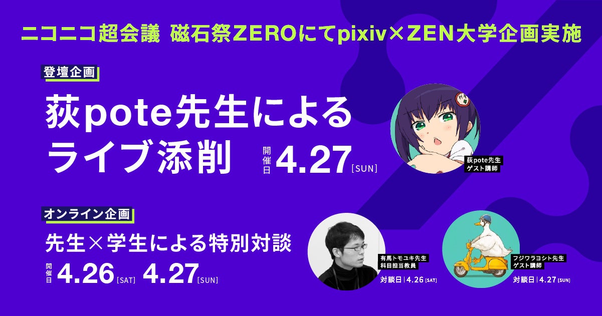 また、pixivとZEN大学のコラボ企画として、4月26日(土)、4月27日(日)にニコニコ超会議内で実施されるZEN大学の文化祭「磁石祭ZERO」にて、荻pote氏によるライブ添削講座や、有馬トモユキ氏およびフジワラヨシト氏と学生による特別対談を実施します。