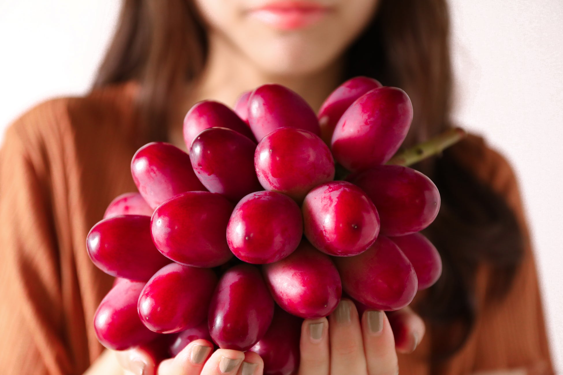 島根県のみで生産している神紅は、20 度以上の糖度、鮮やかな紅色と紅茶のような芳醇な香りが特徴で、種がなく皮ごと食べられる希少なぶどうです。