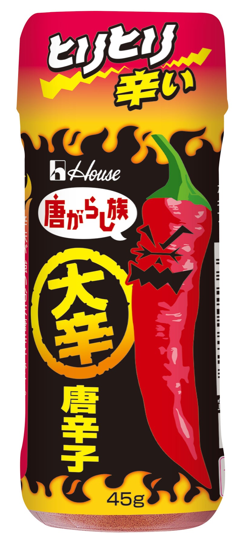 好評発売中の後味のキレのよい辛さを特徴とする「唐がらし族」<大辛>も風味とパッケージデザインをリニューアル。内容量45g、税別希望小売価格360円。