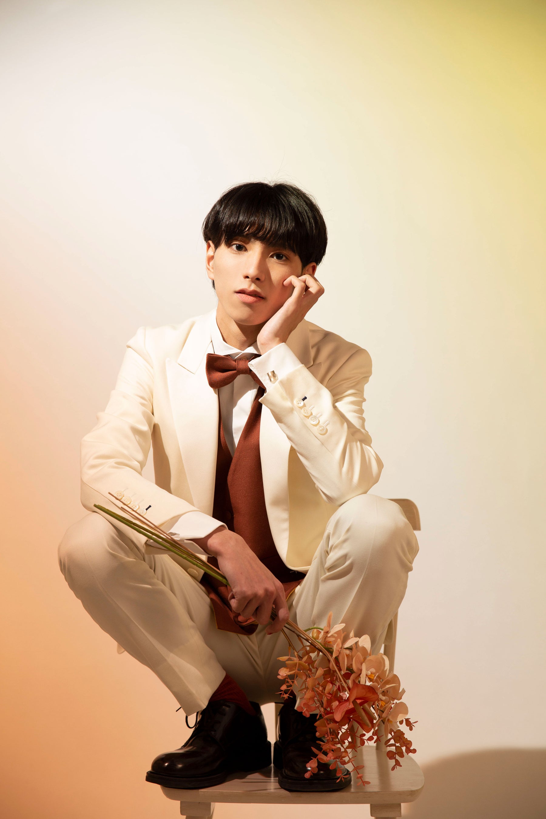 *婚礼のイメージが強いホワイトタキシードにオレンジをテーマにした華やかスタイル