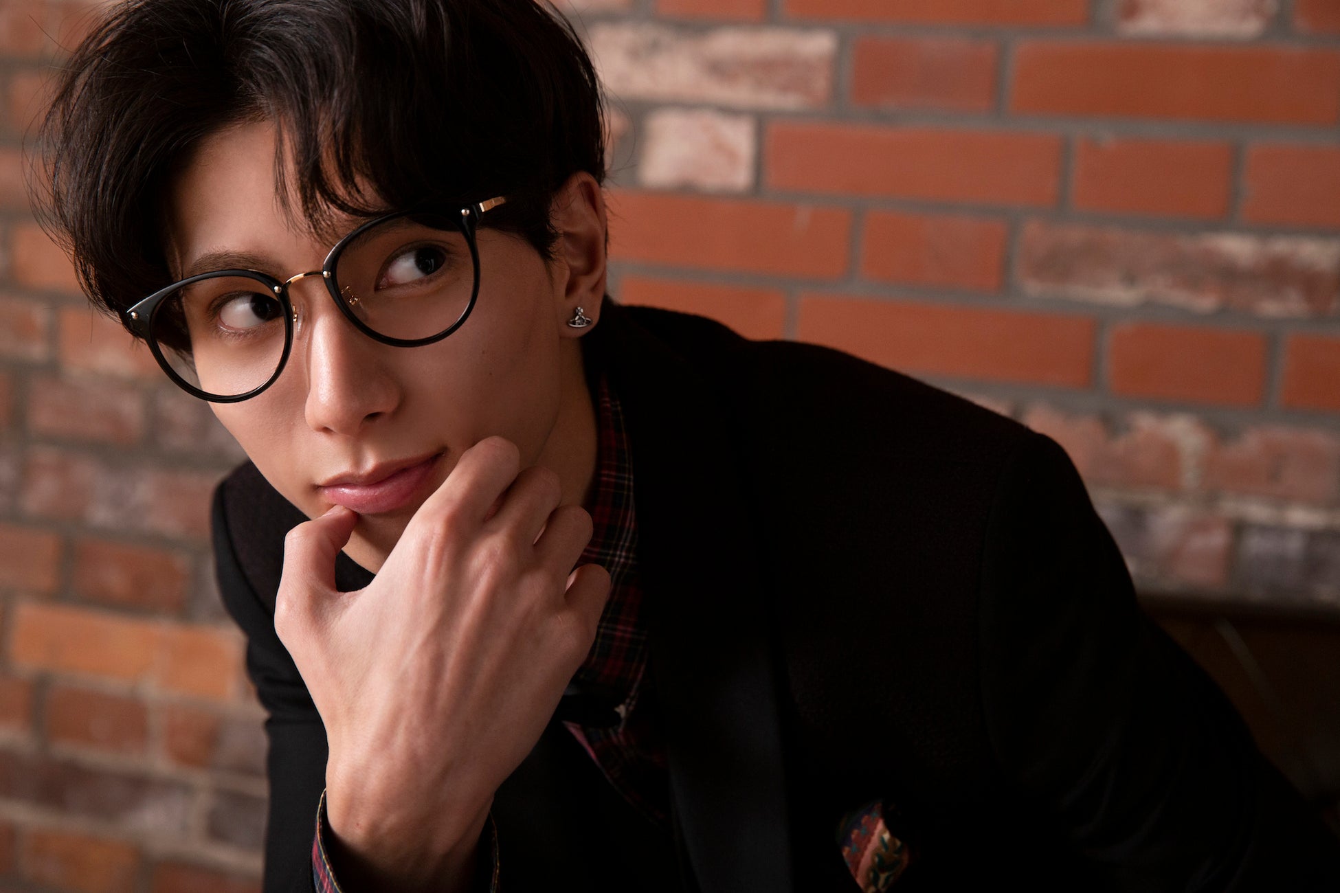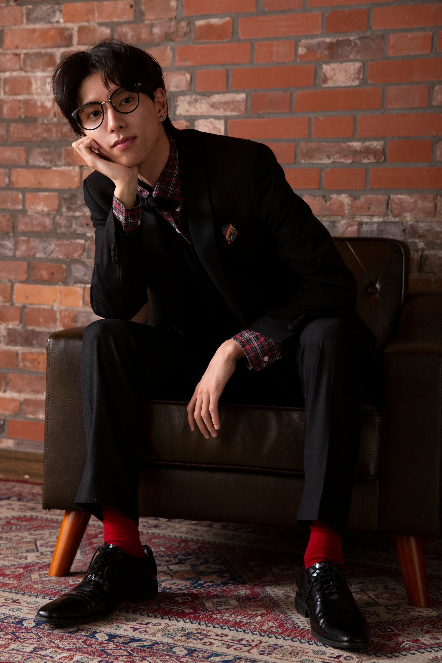 *ブラックタキシードに古着のチェックシャツとメガネをプラス