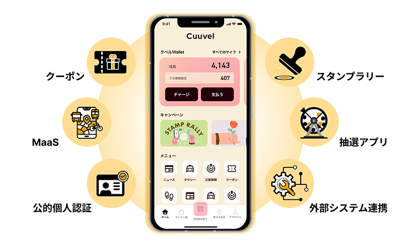 電通総研が開発した地域共創アプリ「Cuuvel」は、地域住民や観光客等その地域に関わる人に向けて、デジタル地域通貨を中心とし、スタンプラリー・クーポン・MaaS 等、さまざまなサービスを提供するスマートフォンアプリケーションプラットフォームです。本アプリは、株式会社コアモバイルの地域通貨プラットフォーム「エコプラ」、株式会社ポケットチェンジのオリジナル電子マネー発行プラットフォーム(デジタル地域通貨基盤)「Pokepay」の機能を活用しています。