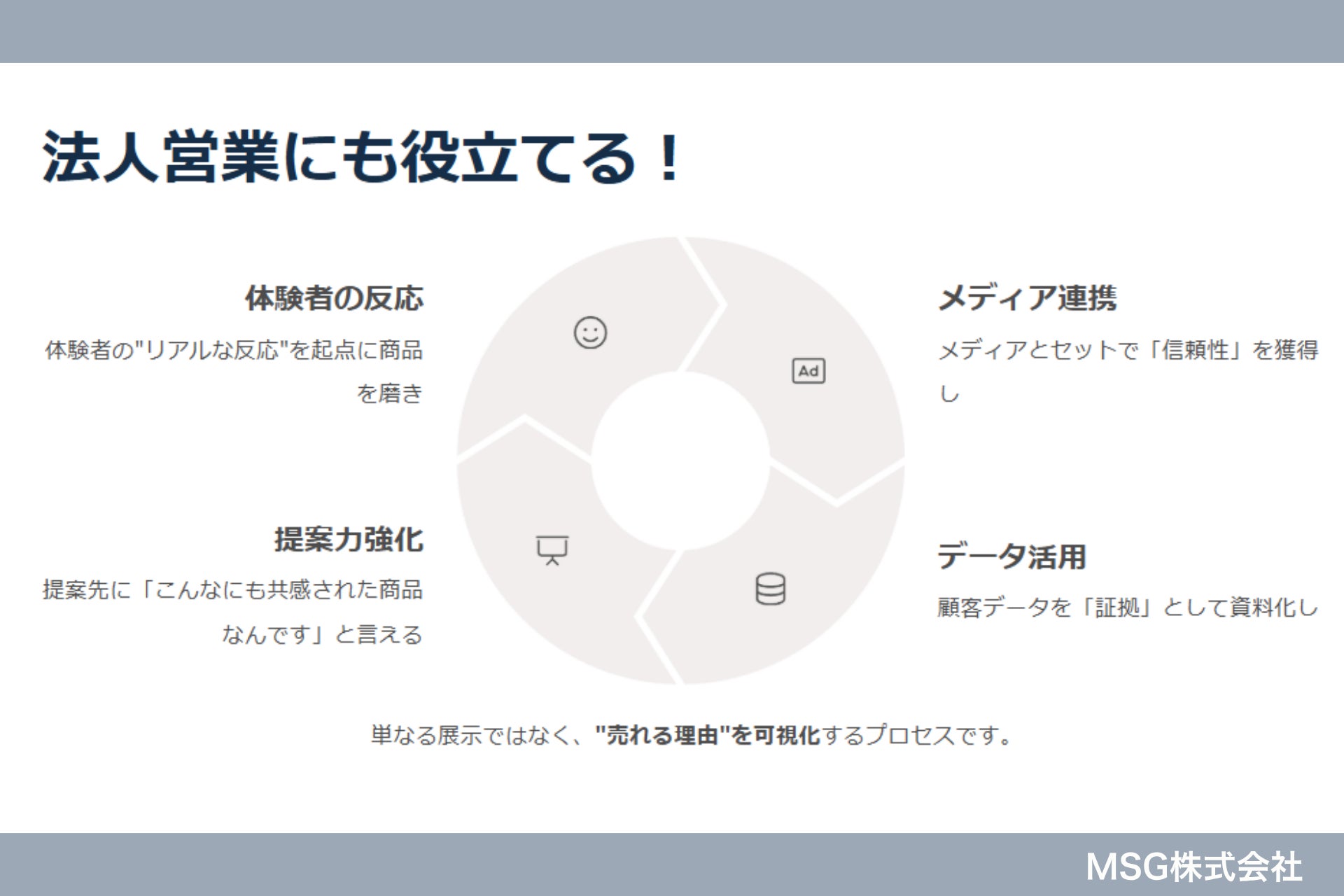 リアルだからこそ伝わる価値__MSGは、この場を“売れる理由を可視化するプロセス”として、多くの企業にご活用いただきたいと考えています。また、ブランドへの信頼感と実績を同時に築ける、新たなマーケティングモデルとしてご活用いただけます。