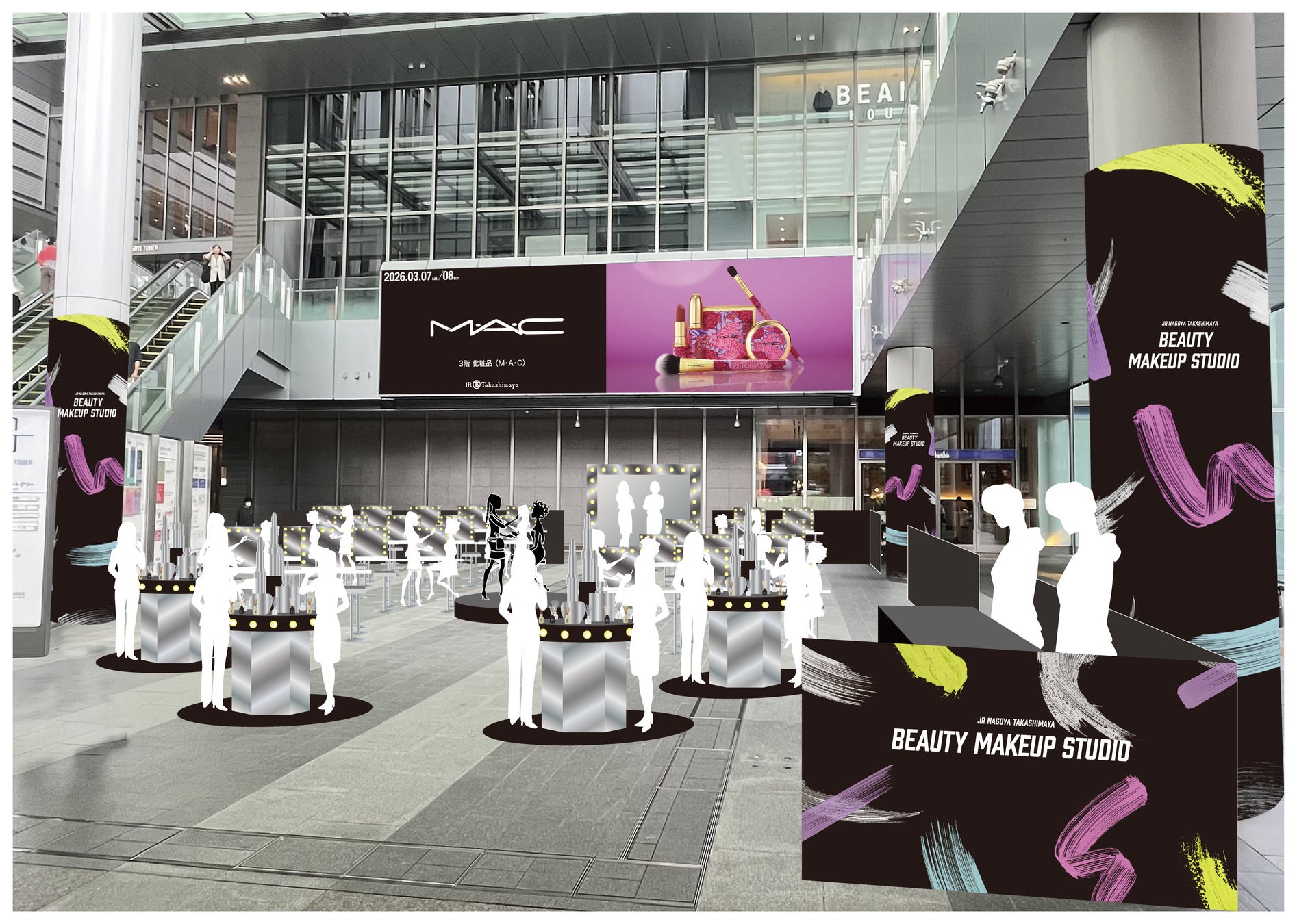 この春の新色・新作コスメを使ったプロによるメイクアップ体験ができるイベント。2度目の開催となる今回は、百貨店のコスメブランドが館内から飛び出し、全国屈指の18ブランドのアーティストが名古屋に集結。頭上のサイネージには各日行われるメイクアップショーの様子も映し出され、まるでメイクスタジオのような特別な空間を創り出します。