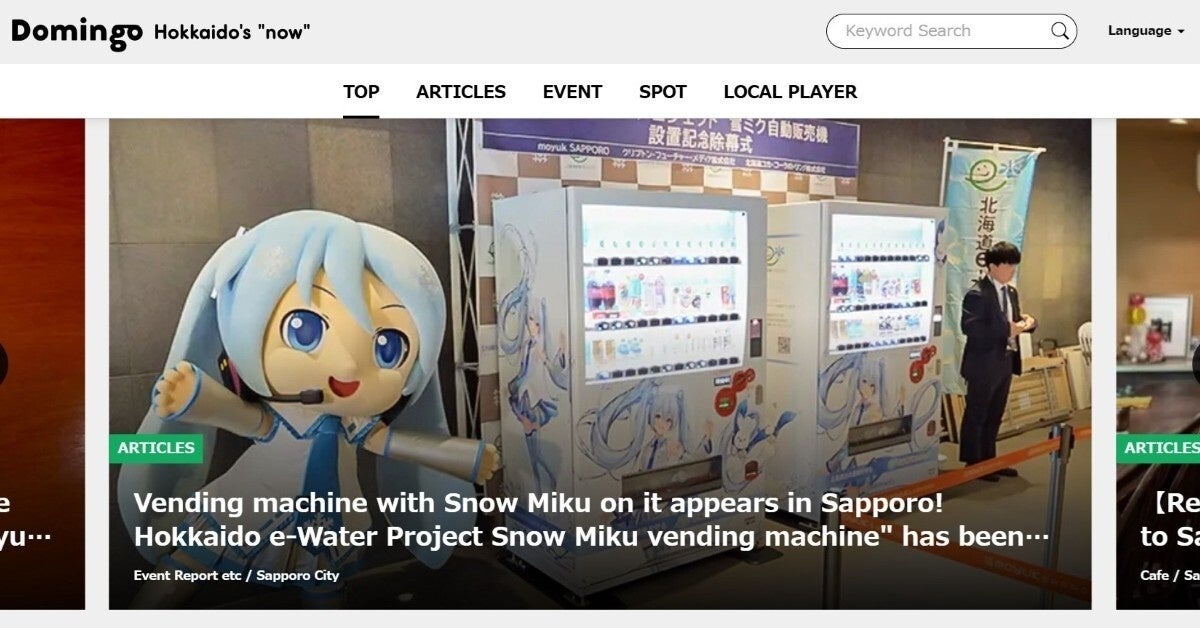クリプトン・フューチャー・メディア株式会社が運営する「Domingo」は、北海道の地域情報に特化したメディア・プラットフォーム。北海道の交流人口・関係人口拡大に寄与するべく、アプリとウェブサイトを通じ、イベントや食などの地域の魅力や、ローカルプレイヤーとして地域に根差した活動を行う方々の取り組みの発信などを行っている。2017年には北海道とのタイアップ協定を締結し、現在までに北海道全179市町村からの公認を受けて運営。