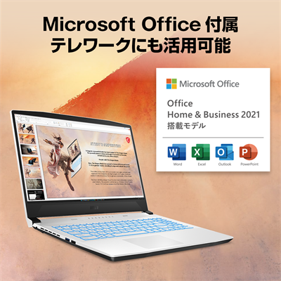 文書作成・表計算・プレゼンテーション作成で欠かすことのできないオフィスソフト「Microsoft Office Home & Business 2021」が標準で付属。永久ライセンス版なので期間を気にすることなくご使用いただけます。プライベートのメール管理やちょっとした書類作成だけでなく、テレワークで自宅にいながらお仕事をする機会が増えたビジネスマンでも活用できるできるため、ゲーミングノートPCながら幅広い用途にご活用いただけます。