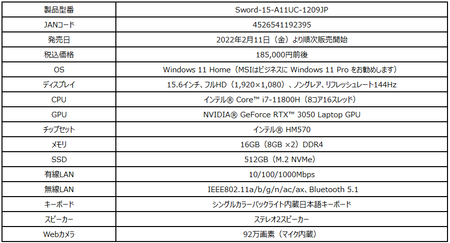 【Sword-15-A11UC-1209JPの主な特徴】