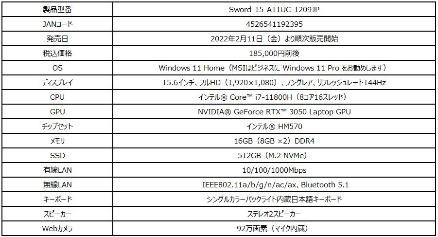 「Sword-15-A11UC-1209JP」には2022年からPCゲームを楽しむ生活をスタートしたいという方にピッタリなスタイリッシュなゲーミングノートPCです。CPUにはデスクトップPC並みの処理性能により、ゲームだけでなくオフィスソフトやクリエイティブソフトを高速・快適動作させることができる8コア16スレッドの「Core™ i7-11800H」を搭載。PCゲームを快適に楽しむために欠かせない3D映像処理を行うグラフィックス機能には「GeForce RTX™ 3050 Laptop GPU」を搭載。国内向けオンラインゲームをフルHD解像度の高画質で快適にお楽しみいただけます。さらに、ワンランク上のゲーミング体験を提供するべく、滑らかでスムーズな映像表示を可能にするリフレッシュレート144Hzゲーミング液晶パネルと長時間のハードなゲーミングでも熱によるパフォーマンスダウンを防ぐ強力冷却システム「Cooler Boost 5」を搭載。内部構成はメモリ16GB、高速SSD 512GBを標準搭載し、初めてゲーミングノートPCをお求めいただく方でも迷うことなくお選びいただけるハイスペック構成となっています。