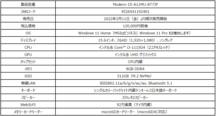 【Modern-15-A11MU-877JPの主な特徴】
