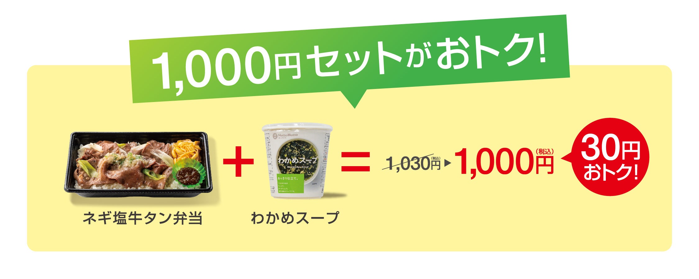『ネギ塩牛タン弁当』と『わかめスープ』とのお得なセット販売も30円引きで実施いたします。