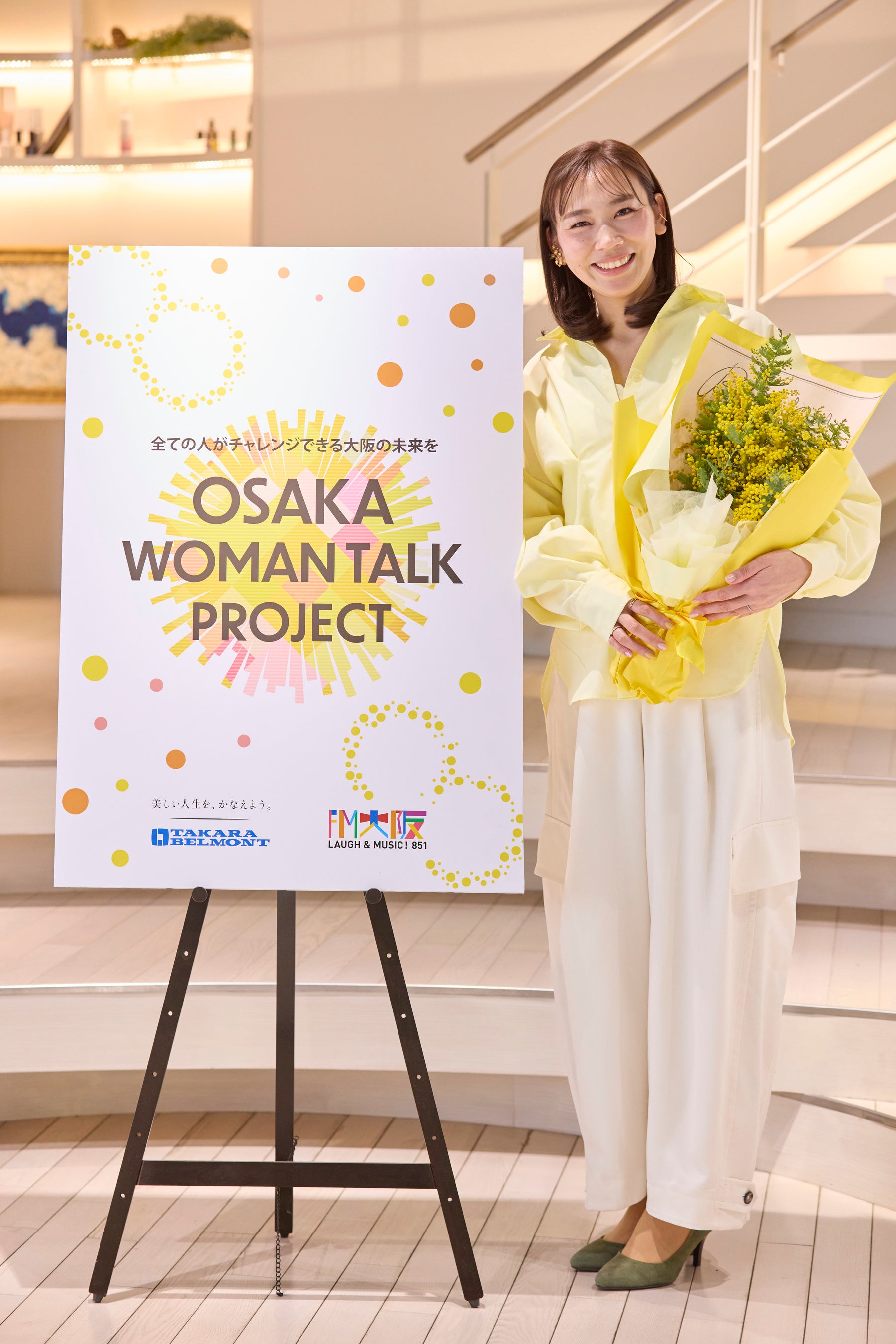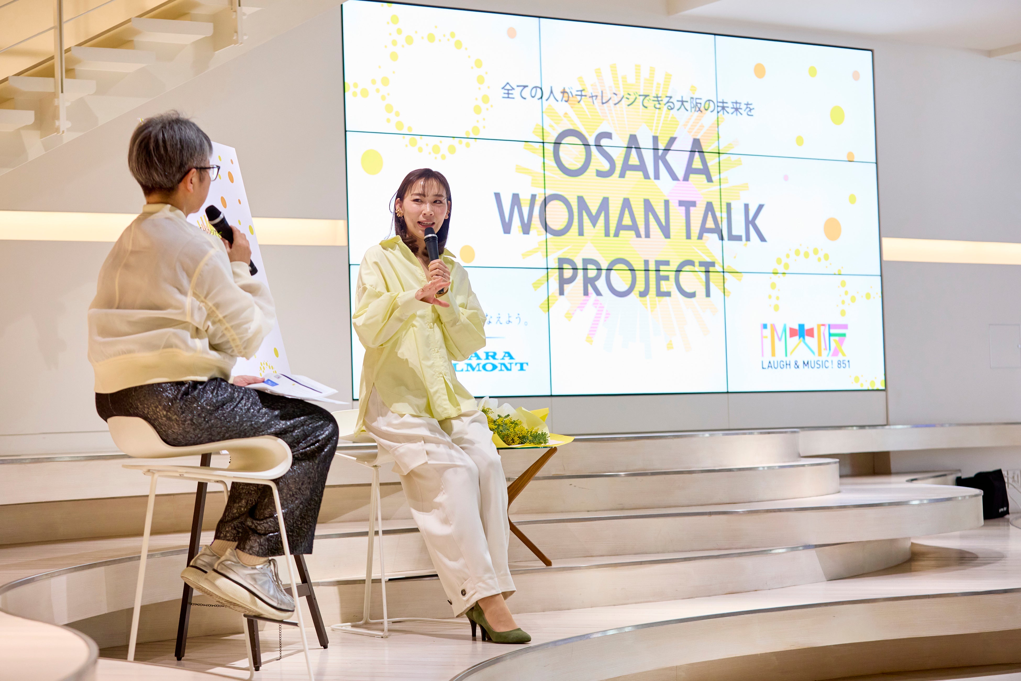 トークゲストとして登壇したFM大阪「intense!」水・木曜日担当DJ・中島静香さんは「女性だから、男性だから、ではなく、一人ひとりがどうしたいかが一番大切。最終的には社会全体で男女関係なくそれぞれのキャリアを歩きやすくするために、1人が少しずつアクションを起こして、まずは女性が生きやすい空気感をつくっていきたい」と語りました。また、国際女性デーを象徴する花・ミモザの一大産地である大阪府箕面市の「ミモザの日in JAPAN推進箕面組織委員会」からご提供いただいた花束を中島さんに贈呈しました。