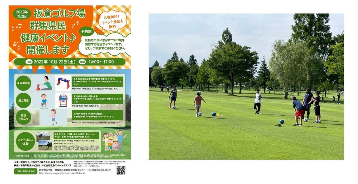 東急リゾーツ&ステイ株式会社(本社:東京都渋谷区、代表取締役社⾧:粟辻󠄀 稔泰、以下、「東急リゾーツ&ステイ」)と株式会社東急スポーツオアシス(本社:東京都渋谷区、代表取締役社⾧:山岸通庸、以下、「オアシス」)は、群馬県板倉町で指定管理者として東急リゾーツ&ステイが運営する「板倉ゴルフ場」を開放し、2022年10月22日(土)に、第2回「群馬県民健康イベント」を開催することをお知らせいたします。