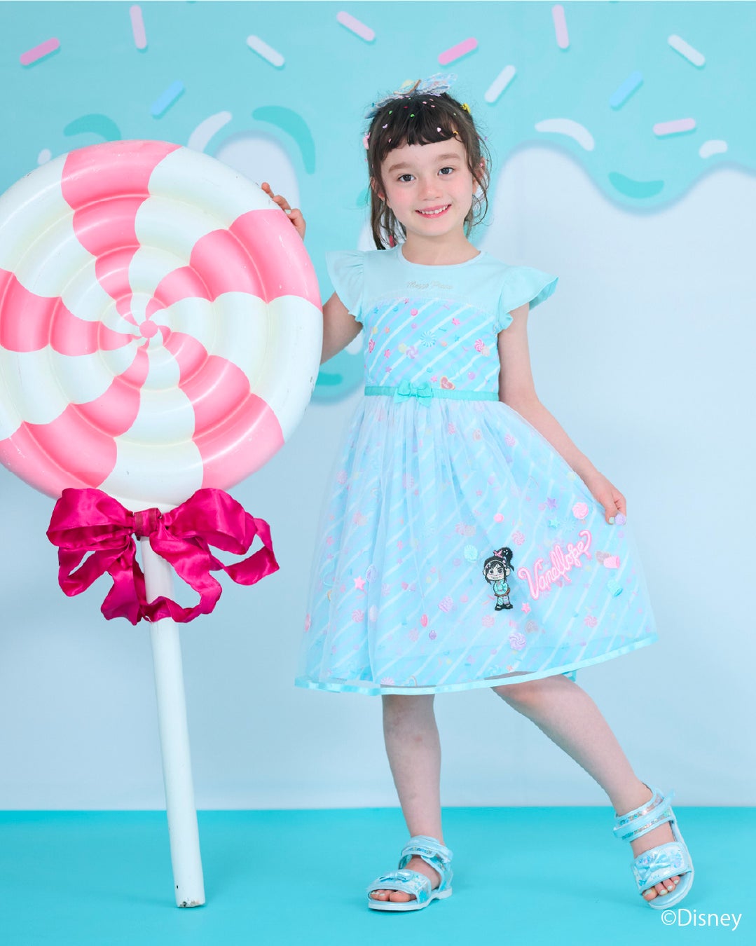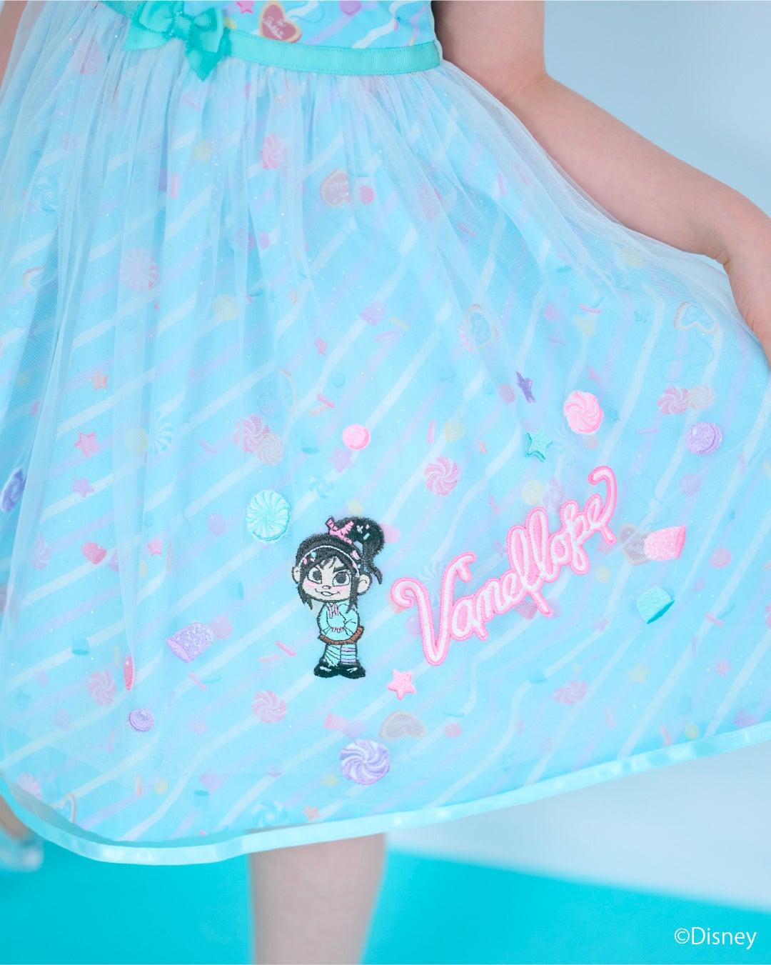 ディズニー・アニメーション映画『シュガー・ラッシュ』に登場するお菓子の世界を描いた総柄プリントと刺繍で、キュートな世界観をたっぷり表現したワンピースは、ボリュームのあるシルエットで主役級のとびきりガーリーなアイテム。